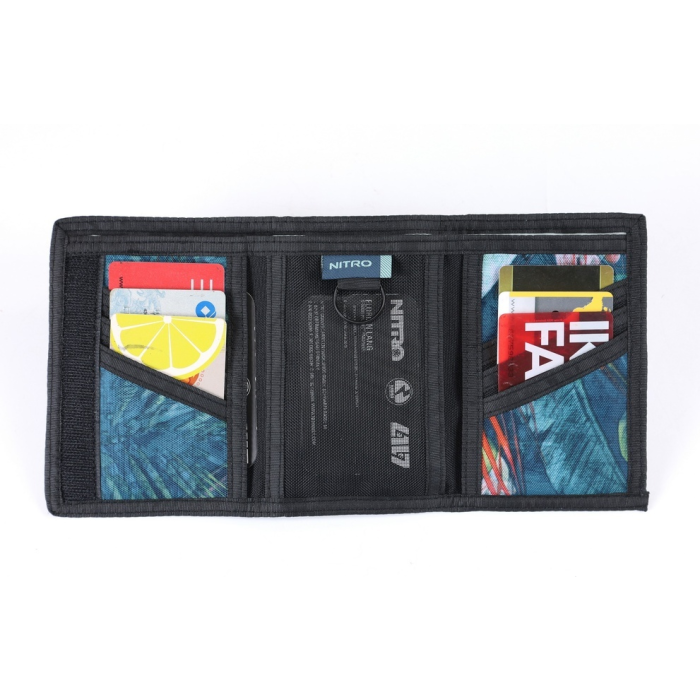 Textilná peňaženka na suchý zips. Vrecko na drobné na zips, vrecko na doklady, priehradky na karty, očko na kľúče, či retiazku. Veľkosť 14x10 cm. Materiál 600D polyester. Hmotnosť 60 g.