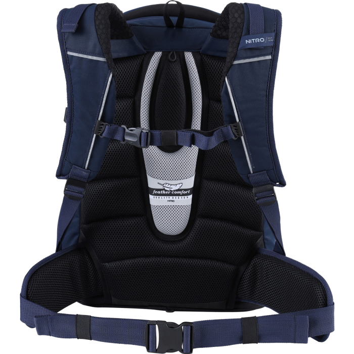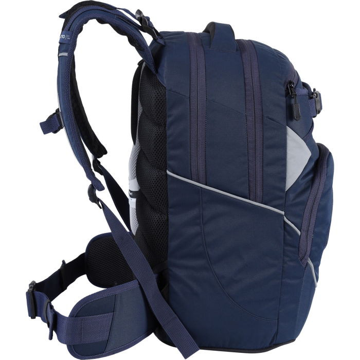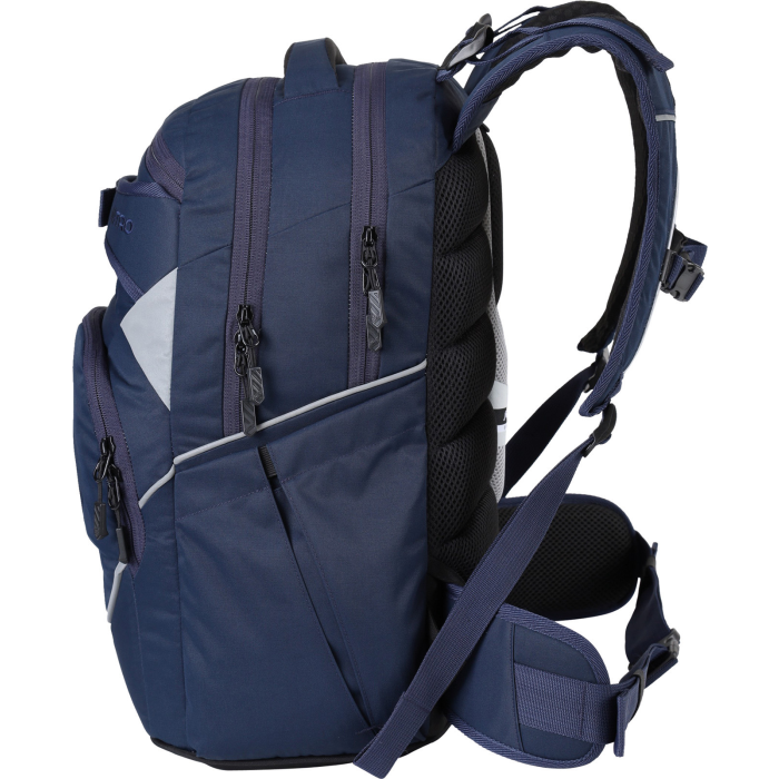 Fleecom vystlané vrecko na okuliare a podobne chúlostivé veci, dve hlavné priestranné oddelenia, z ktorých jedno obsahuje organizér na zložky a zošity, fleecové vrecko na tablet. Predné termoizolačné vrecko čo uchová studené pitie alebo desiatu pekne v chlade, postranné vrecko na fľašu, odpínací bedrový pás, ľahký a priedušný chrbtový panel "Feather comfort". Nechýbajú reflexné prvky zo všetkých strán, mäkké ucho v hornej časti a pohodlné ergonomické popruhy z mäkkej sieťoviny s nastaviteľným hrudným pásom. Objem 32 l. Rozmery 44 x 30 x 22 cm. Hmotnosť 1,1 kg.