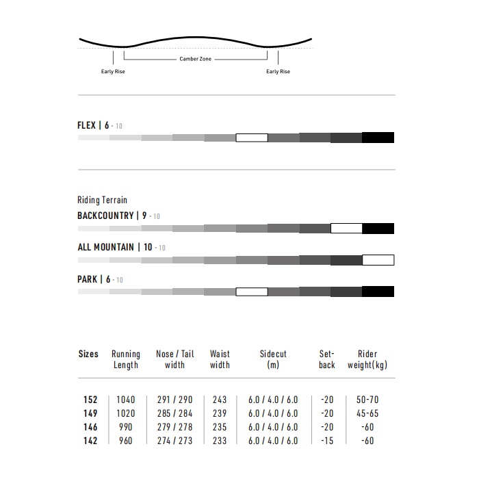 Každý oblúk na tejto doske je nezabudnuteľný. Zábavný a univerzálny tvar dosky Drop spoľahlivo podrží na hrane, nie je však agresívny, a tak vám jednoducho pomôže získavať sebadôveru a zlepšovať techniku. Ak snívaš o dlhých oblúkoch v panenskom prašane aj na zjazdovkách alebo o objavovaní nepoznaných zákutí hôr, potom určite vo svojich snoch vidíš aj Drop. S touto doskou vďaka jej všestrannému tvaru a dozadu posadeným postojom sa ponesieš prašanom ako snežná gazela. Oporu v oblúkoch zaistí prehnutie Cam-Out. Pri rannej carvovačke na čerstvo vypiplanom manžestri prídu vhod aj Power Pody, ktoré hrany dosky doslova pribijú do oblúka a podržia ťa aj na naleštenej platni. Sklznica Sintered Speed Formula HD sa postará o rýchle štarty. Uteč mestu a strastom života, tvojím kumpánom sa rád stane Drop. Môžeš s ním vyčíňať v akomkoľvek teréne, v akomkoľvek počasí. * TVAR: DIRECTIONAL * CAMBER: CAM-OUT * ŠÍRKA: ŠTANDARD * PRUŽNOSŤ: ALL TERRAIN, 6/10 * VYKROJENIE: DUAL DEGRESSIVE * JADRO: POWERCORE, POWER PODS, LAMINÁT: BI-LITE, SKLUZNICE SINTERED