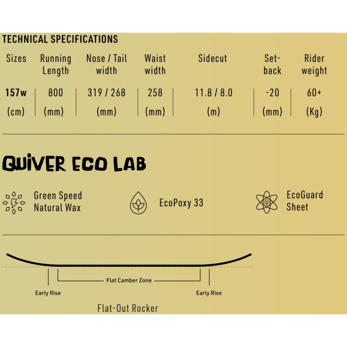 Nový tvar a dizajn dosky Quiver Pow ti prinesie more zábavy. Špeciálne tvarovaná pintailová pätka umožní rýchle rezanie oblúčikov, efektívne spŕšky prašanmi a svižný prejazd medzi stromčekmi v lesíku, a to aj na tom najnudnejšom svahu so sklonom modrej zjazdovky. Pre tých, čo hľadajú super surfy pocit z jazdy v prašane, prináša novo tvarovaná pätka u Quiver Pow dosky skvelú príležitosť zažiť niečo unikátne. Tento starý známy, krátky, podsaditý a veľmi zúžený prašanový pintail board ponúkne tú najlepšiu prašanovú jazdu, ktorú môžeš zažiť. Prehnutie Flat-Out Rocker a tuhší All-Terrain flex ti umožní rýchlo manévrovať cez tie najhustejšie stromy a široký nose ti dovolí plávať snehom bez ohľadu na to, či ide o vysoký útes alebo plochý svah. Progresívne vykrojenie ťa podrží na zjazdovke, takže sa nemusíš báť vziať dosku do rezortu, keď práve počasie nedovolí vyčíňať mimo. Inovovaný Quiver Pow Pintail je navrhnutý pre všetkých zarytých lovcov prašanu, čo si chcú užiť jazdu prachom nehľadiac na počet napadnutých čísel a počet stupňov sklonu svahu. Garantujeme, že si užiješ každý „pow“ run, ktorý si s týmto borcom dáš. Tento rok sme celú Quiver sériu opuncovali zeleným kolkom udržateľnosti a opatrili všetky dosky materiálmi priateľskými k našej planéte. Sklznica je vyrobená z novej generácie Eco Poxy 33 epoxidu založenom z 33% na rastlinnej báze a je napustená biodegradovateľným prírodným Green Speed voskom. Na výrobu Eco Guard Topsheetu je z 90 % použitých postprodukčných odrezkov a zvyškov, ktoré tak dostávajú druhú šancu a znižujú tým množstvo spotrebovaných nových materiálov i odpadov. Zelenou bodkou je potom biodegradovateľný prírodný Green Speed vosk pre hladký pojazd. * TVAR: TAPERED PINTAIL * ROCKER: FLAT-OUT * ŠÍRKA: WIDE * PRUŽNOSŤ: ALL TERRAIN, 7/10 * VYKROJENIE: PROGRESSIVE * JADRO POWERCORE, BI-LITE LAMINÁT, SKLUZNICE PREMIUM EXTRUDED FH