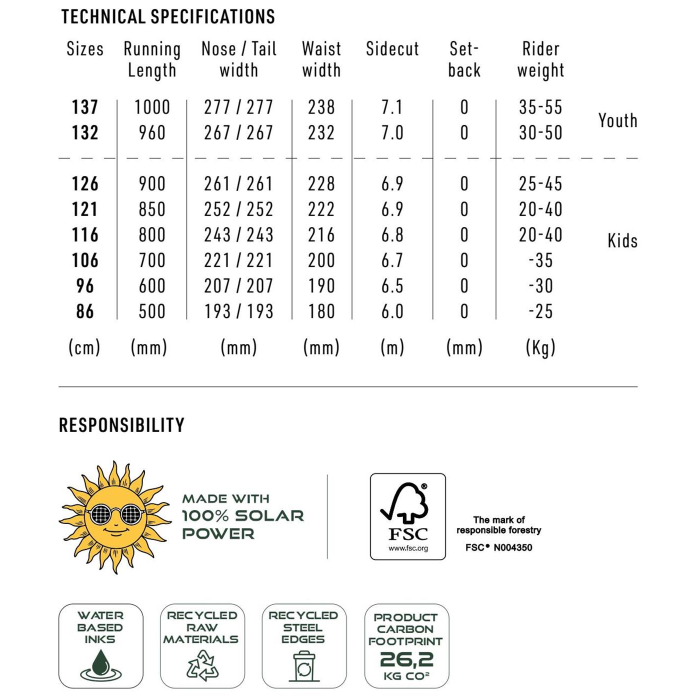 Doska, na ktorom je zábava sa učiť. Flat-Out Rocker predchádza nechcenému zahryzovaniu hrany, ľahko nadväzuje oblúky, ľahko brzdí. Vďaka tejto konštrukcii si vaše ratolesti podmania celé hory av pohode absolvujú aj prvé krôčiky, skovky a slajdíky v snowparku. Mladí dravci sa na novo reshapovanom Ripperi x Volcom ľahko naučia ovládať snowboard na hrane a brzdiť aj kontrolovať rýchlosť jazdy. Veľmi skoro sa tak stanú plnoprávnymi členmi vašej jazdiacej rodiny. Presnú jazdu bez nečakaných zádrhelov a zákusov prináša Flat-Out Rocker. Pružnosť dosky - Softride Flex - je nastavená tak, aby sa prirodzene ohýbalo pod deťmi všetkých veľkostí, ktoré sa chcú celé dni baviť skotačením na snehu. Táto Twin doska pomáha tým najmladším rýchlo dohnať skúsenejších jazdcov. Ripperom začína snowboarding! Tento rok sme naše snowboardy opuncovali zeleným kolkom udržateľnosti a opatrili všetky dosky materiálmi priateľskými k našej planéte, recyklovanými hranami av celom výrobnom procese využili iba solárnu energiu. * TVAR: TWIN * ROCKER: FLAT-OUT * ŠÍRKA: ŠTANDARD * YOUTH PRUŽNOSŤ: SOFTRIDE, 2/10 * VYKROJENIE: RADIAL * POWERCORE, BI-LITE LAMINÁT, SKLUZNICE PREMIUM EXTRUDED FH.