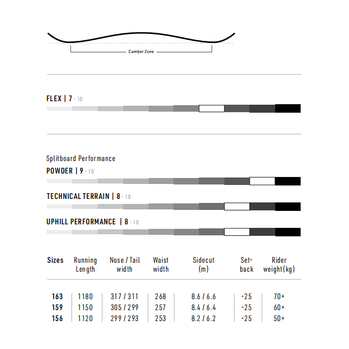 Obľúbenec medzi freeride doskami a splitmi Squash je novo pretvarovaný, aby bola tvoja jazda v prachu plynulejšia a prechod z hrany na hranu jednoduchší. Vymakanejšia špička je dlhšia, takže sa ti fakt nepotopí, ani keď dáš omylom plnú váhu na prednú nohu as zdvihnutou lastovičou pätkou sa zase nemusíš báť ísť v nebezpečných pasážach na switch. Squash jednoducho váľa v prachu aj kárve. Navrhnutý tak, aby si si na ňom užil „pow days“ a to bez potreby kupovať si permicu. Skonštruovaný na bezchybný výkon vo všetkých možných podmienkach a terénoch. Vďaka Progressive vykrojeniu a Trüe Camber prehnutiu sa môžeš tešiť na nekompromisnú ovládateľnosť, takže budeš oblúky kosiť ako profík. Zatiaľ čo tvar Tapered Swallowtail ti ponúkne naozaj kráľovskú jazdu prašanom. Directional Splitboard ti dovolí robiť oblúky, pri ktorých sa nenadrieš a budeš ich prechádzať s maximálnym štýlom. Rýchla sklznica Sintered Speed Formula HD ti zase pomôže prekonať zradné rovinky. Vďaka predvŕtaným otvorom na špičke a päte bude aplikácia pásov rýchlejšia ako inokedy, a to najmä s našimi Nitro x Kohla Squash stúpacími skiny, ktoré ti umožnia bleskový a precízny prechod z módu túry na jazdu. Ak hľadáš split, ktorý ťa po výstupe nahor poriadne zvezie dole, už nehľadaj ďalej a upri svoj zrak na Squash Split! * TVAR: DIRECTIONAL SWALLOWTAIL SPLITBOARD * CAMBER: TRÜE * ŠÍRKA: MID-WIDE/WIDE * PRUŽNOSŤ: ALL TERRAIN, 7/10 * VYKROJENIE: PROGRESSIVE * JADRO POWERLITE CORE, BI-LITE LAMINÁT, BI-LITE LAMINÁT, ROZOSTAVENIE INSERTOV VOILE, ZÁMKY NA PATCE I ŠPIČKE, KOVANÉ SPOJOVACIE HÁČKY Z HLINÍKA T7075.
